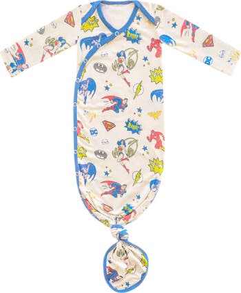 Premium knit fabric brings a soft and stretchy fit to this adorable knotted gown covered in a Justice League print.
