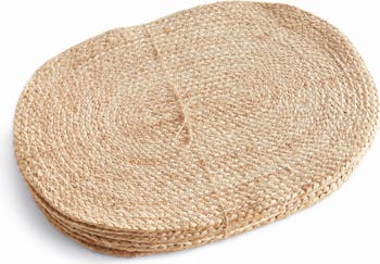 - This set of eight oval placemats adds a natural element to your tablescape. Ideal for special occasions as well as everyday use. Each placemat is made of real jute, coil woven by a skilled artisan. The thick weave adds a warm, welcoming feel.