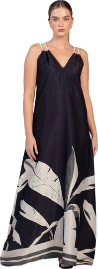 This effortlessly elegant maxi dress features delicate rope straps that extend to the back, tying into a subtle bow for an adjustable fit. The flowing A-line silhouette and deep V-neckline at the front add a touch of allure.