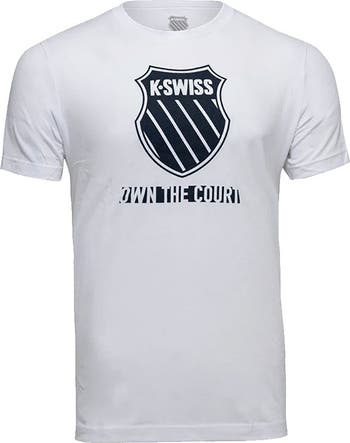 The K-Swiss Own the Court Men's Tennis Shirt is crafted to enhance performance and comfort for tennis players. This shirt features moisture-wicking fabric to keep you dry during intense matches. Its athletic fit allows for a full range of motion, essential for optimal performance.