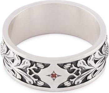 Inspired by the ancient Japanese Samurai helmet, this hefty band ring is engraved with traditional floral motifs and set with a red cubic zirconia symbolizing the country's flag.