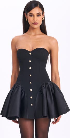 The Kaden Dress radiates timeless elegance with its sleek black design and refined details. Featuring a graceful sweetheart collar and a chic strapless silhouette, it’s designed to make a statement. The drop waist enhances your figure, flowing into a voluminous skirt supported by inside skirt structure for added flair. Thoughtfully designed with non-slip straps for a secure fit, the dress is adorned with golden buttons that add a touch of luxury. An invisible zipper ensures a seamless finish, making the Kaden Dress perfect for any special occasion. Materials: Woven Stretch Crepe Length from underarm: Approx 22.8 inch / 58 cm Stretch Factor: Mid Stretch Clean: Dry-clean only Model is Wearing a Size XS (US-2) Model is 5'11'' Color may vary due to lighting on images. The product images (without model) are the closest to the true color of the product.