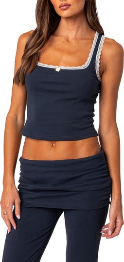 Charming lace trim skims the edges of a cropped tank that features a square neckline and dainty rosette.