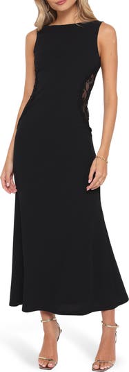 Sheer lace panels add understated allure to a stunning maxi dress with a demure neckline and subtle trumpet silhouette.