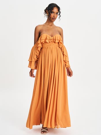 Elevate your getaway wardrobe with the romantic Kaela Dress in a warm brickwork hue. Designed in airy chiffon, this off-shoulder silhouette features delicate ruffle trims that frame the neckline and cascade down its layered maxi skirt. The high waist flatters the figure, while padded cups offer added support and shape. Complete with an invisible zipper and fully lined construction, it's a dreamy choice for holiday escapes, wedding guest looks, or effortless vacation elegance. Materials: Chiffon Length from underarm: Approx 44.4 inch / 113 cm Stretch Factor: Non Stretch Clean: Dry-clean only Model Is Wearing A Size XXS (US-0) Model Is 5'11'' ng on images. The product images (without model) are the closest to the true color of the product.