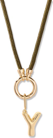A personalized necklace that you can personalize even further features a gleaming initial charm hung from a key ring pendant with room enough for more charms of your choosing.