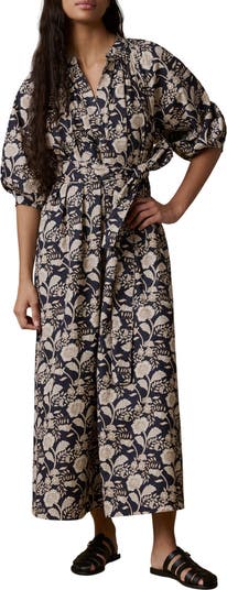 Coastal-inspired florals bring fresh contrast to this organic-cotton poplin midi dress finished with voluminous puff sleeves and cinched with a removable tie belt.