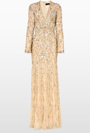 Radiate timeless glamour in this almond-hued gown, an exquisite creation adorned with shimmering beadwork and sequins that trace intricate patterns throughout. The plunging V-neckline and cinched waist create a beautifully flattering silhouette, accentuating the figure with grace and precision. Full-length sleeves add an elegant, sophisticated touch, enhancing the gown's refined appeal. The delicate embellishments reflect light gracefully, ensuring a breathtaking entrance at any event.