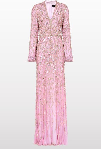 Radiate timeless glamour in this almond-hued gown, an exquisite creation adorned with shimmering beadwork and sequins that trace intricate patterns throughout. The plunging V-neckline and cinched waist create a beautifully flattering silhouette, accentuating the figure with grace and precision. Full-length sleeves add an elegant, sophisticated touch, enhancing the gown's refined appeal. The delicate embellishments reflect light gracefully, ensuring a breathtaking entrance at any event.