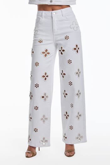 - Allover floral cutout embroidery with faux pearl trim