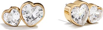 These charming earrings are fashioned from dazzling double hearts of cubic zirconia that are bezel set in gleaming goldtone plate.