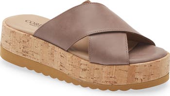 This simple Italian-made crisscross slide set on a chunky cork flatform keeps you comfy all day long.