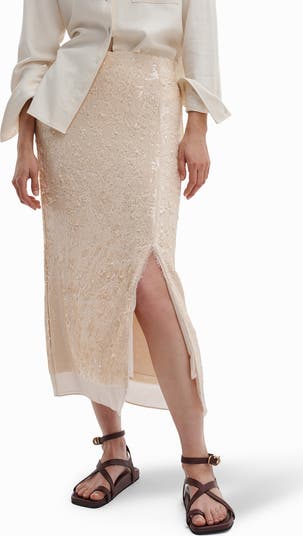 Lustrous sequins add shine and dimension to this figure-skimming midi skirt made with an airy side slit for easy movement.