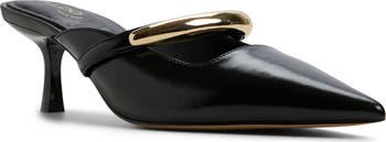 Polished bit hardware highlights the mule-inspired silhouette of a pointy-toe pump complete with a comfort-cushioned footbed.