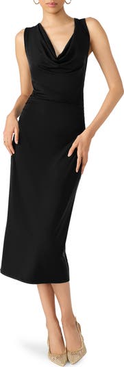 Cross straps bridge the open back of this curve-skimming midi dress defined by an asymmetric cowl neckline that drapes effortlessly and shows off your décolletage.