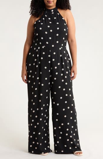 Your new go-to party ensemble is a one-and-done jumpsuit cut with a halter bodice, handy pockets and is patterned in peppy polka dots.