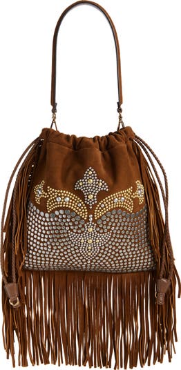 This boho-chic suede shoulder bag is inspired by vintage art-deco pouches with intricately patterned stud detailing on the front and a curtain of lavish fringe cascading from the edges.