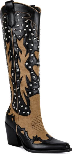 Polished studs highlight the intricate appliqués of this classic Western boot in a knee-high silhouette.