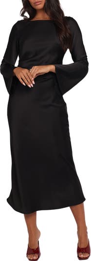 This long-sleeve cocktail dress balances elegance and intrigue with a clean bateau neckline in front and a softly draped cowl back tied with a delicate bow. Ruched through the bodice to flatter the figure, it's finished with bell sleeves, a subtly flared skirt and stretch fabric that moves with you.