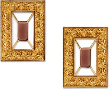 Crafted in brass, finished in a dull glossy 22k yellow gold plating and set with Amethyst baguettes, the Kamel Earrings are a beautiful juxtaposition of statement and simplicity.