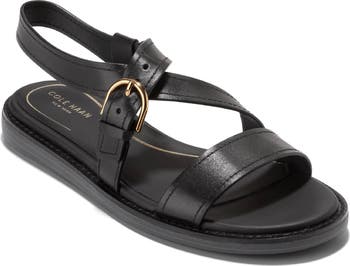 Crisscrossing straps add subtle dimension to a slingback leather sandal set on a stacked wedge heel for a hint of height. A Grand Lux Technology footbed with FlexCraft cushioning promote optimal comfort and natural movement.
