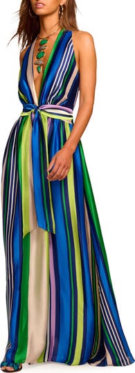 Vivid stripes brighten this tie-waist maxi cut from glossy skin-skimming satin and fronted with a daringly dipped neckline.