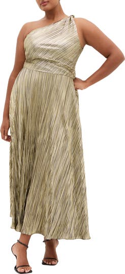 Light up the night in this shimmering metallic maxi designed in a richly textured fabrication and cut in a sleek shoulder-baring silhouette.