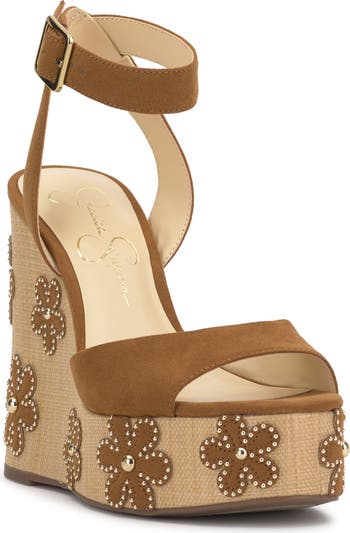Studded floral appliqués stand out against the woven platform and integrated wedge heel on a '70s-inspired sandal secured with an adjustable strap at the ankle.
