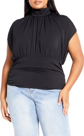 Designed to look cute and feel comfy, this solid mock-neck top is framed by slouchy dolman sleeves and a wide waistband with side ruching.