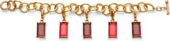The Kandi Bracelet is handcrafted in 22k gold-plated brass and accented with baguette-cut purple Amethyst and pink Topaz glass gems. The detachable stones can be played around with and adds versatility to the design. Adjustable and lightweight.
