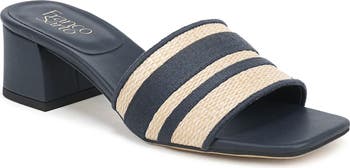 An elegant mixture of raffia and leather distinguish the upper of this slip-on sandal elevated on a slight block heel.