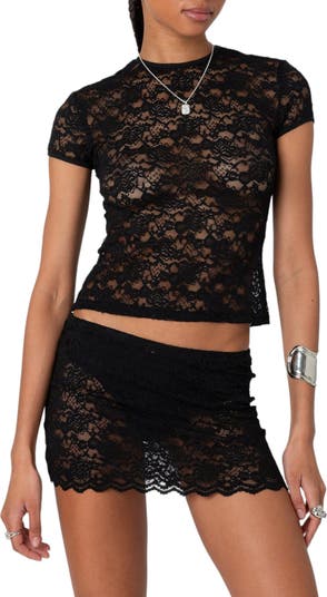 Airy and sheer stretch lace hugs your shape in this beguiling little T-shirt.