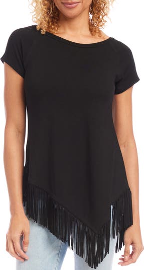 This longline top is updated with abbreviated raglan sleeves and an angled fringed hem.