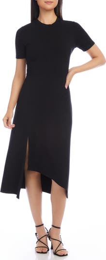 An asymmetric hem with a leggy slit lends modern-chic vibes to this lightweight jersey dress cut to an on-trend midi length.