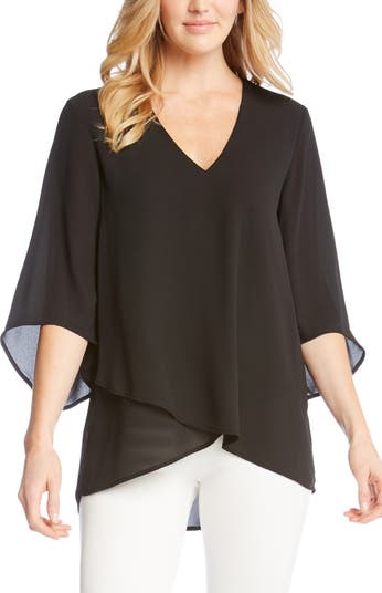 An elegant top of silky, lightweight crepe delivers elegant movement with its angled flare sleeves and fluttery asymmetrical hemline that dips low in back.