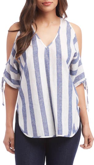 Go from beach to BBQ in this breezy shoulder-baring top styled with tied sleeves and eye-catching stripes.