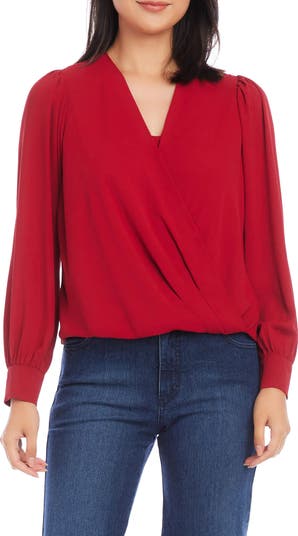 A drapey wrap-inspired front complements the buttery lightweight crepe fabric of this versatile solid-hued top.