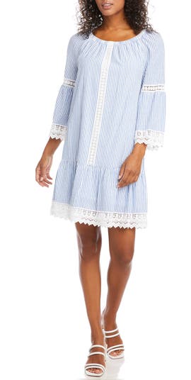 Charm from day to night in this breezy striped dress styled with lacy accents and scalloped trims.