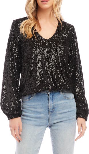 Billowed blouson sleeves frame this dazzling top covered in sparkly sequins for an attention-grabbing night-out look.