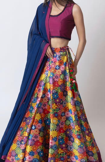 The Kari Floral Lehenga Choli Set is crafted from soft silk. The lehenga features a bold, colorful floral print that’s both eye-catching and timeless. The matching blouse adds a modern touch with mirror-embroidered borders and a chic circle-back design. Completing the lehenga choli set is a lightweight georgette dupatta, adorned with mirror work that echoes the blouse’s detailing. Perfect for those who love retro charm with a contemporary twist, this lively lehenga choli set is made to stand out.