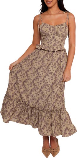 Delicate blooms bring vintage-inspired charm to this flowy maxi romanced by floaty ruffles.