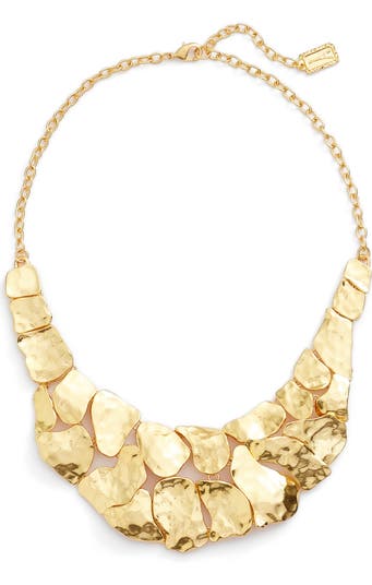 Luxurious in shine, this sculptural collar necklace recalls sunlight bouncing off rippling water.