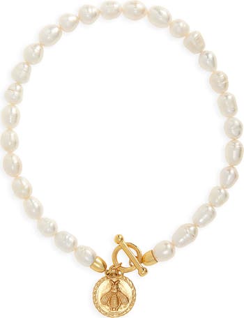 Classic pearls form the prettiest chain for this choker gleaming with a bee-embossed gold pendant.