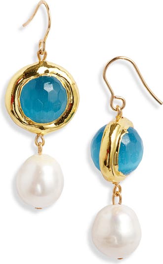 Freshwater pearls and signature faceted crystals adorn organic-inspired drop earrings that are plated in 24-karat gold.