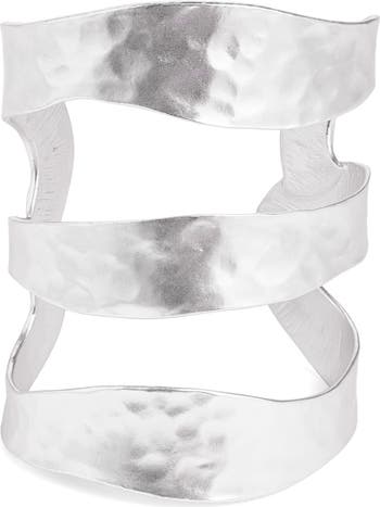 A hammered finish and sterling silver plating make this stacked cuff catch light as you move.