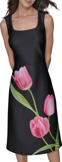 Brilliant tulips burst from the hem of this elegant square-neck satin midi dress.