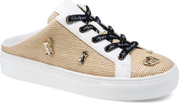 Polished logo accents gleam from this sporty mule framed by decorative lace-up ties and boosted by a white platform sole.