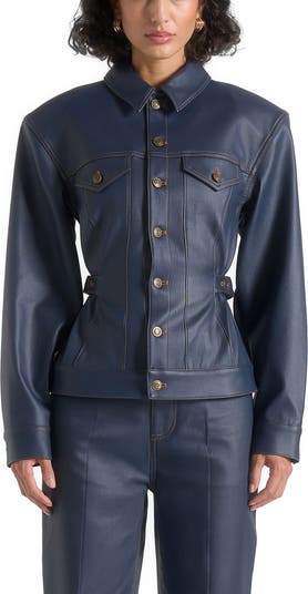 Crafted with a sleek wax effect finish, this piece combines utility inspired design with refined tailoring. A cinch waist with side adjusters allows for a personalised fit, while contrast stitching adds definition and detail. Statement feature buttons and gold hardware accents elevate the look, with front pockets maintaining a clean, streamlined finish.