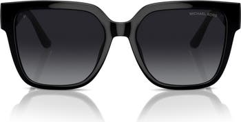 Logo hardware glimmers at the temples of square sunnies fitted with glare-reducing polarized lenses.