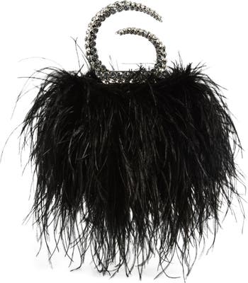 A glitzy, crystal-embellished handle swirls over the top of this satin evening clutch designed in a structured, elongated silhouette covered in a wispy plume of feathers.